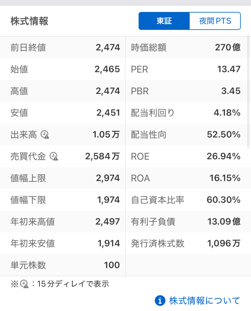 今回の購入価格は1株2,465円。学究社の年間配当金は1株あたり103円のため配当利回りは4.17%となります。